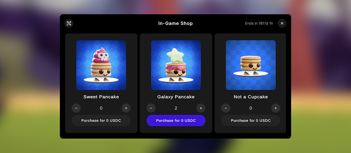 ERC1155コントラクトのゲームアイテムを利用したゲーム内ショップを表示できます。ユーザーは任意のカスタムまたは既存のERC20通貨で購入できます。