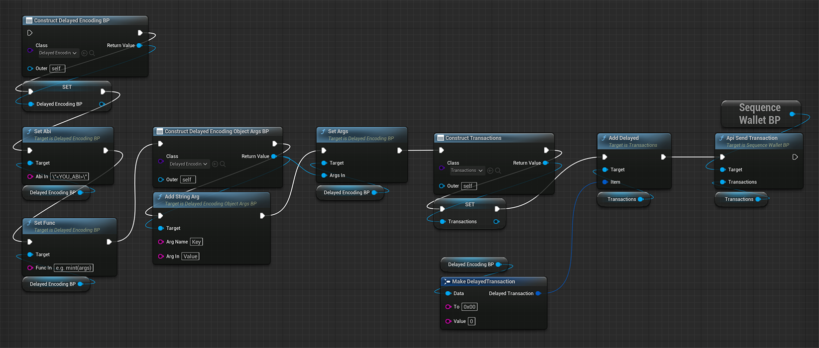 Blueprints で作業する場合は、サーバーサイドでエンコードする遅延エンコードトランザクションを使うと、コントラクト呼び出しが簡単です。- ブループリント