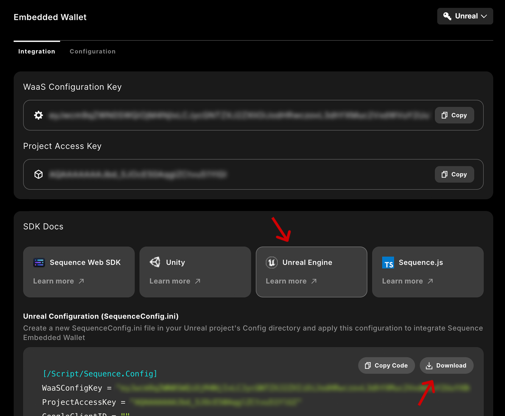 Project Access Key and WaaS Configuration Key from Onboard > Embedded Wallet,
